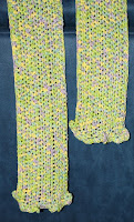 Gedifra Fiocco (2005 collection #4072) and has a slight mermaid sheen to it. I crocheted horizontally single, single, half double half double and repeat until I got to 5 inches by 5 1/2 feet long (petite mom) and then added a 5x1 shell edge to give it a little ruffle.
