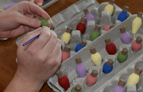 2- Paint the "metal" part of the ornament with a color similar to a real light bulb. To keep the wet paint from getting on anything, I used empty egg cartons to hold the ornaments while they dried.