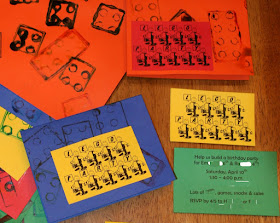 Em and Ro made the Lego paper with card stock I had on hand. Once dried, we cut the paper down to fit the envelopes and added the party details.