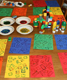 All you need is a bit of card stock, a free font, washable paint, a cool Lego stamping tutorial, willing crafters, and a whole lotta patience! Oh, and the Legos of course...