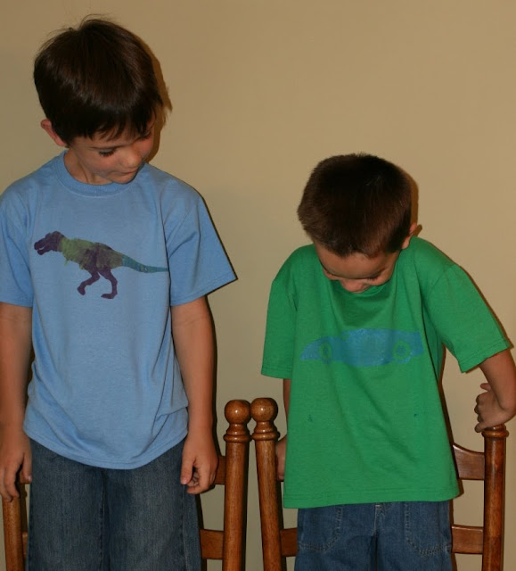 First, I bring you a few quick photos and, tomorrow morning, a recipe for some tasty turkey meatloaf. But tonight, pretty pictures! The boys have been having fun crafting. I swear, customizing shirts with freezer paper stencils never gets old! Here are Em and Ro's latest creations. This summer, we plan to cover a few other shirts with fabric cut-outs. I'll make a quick tutorial for that soon.
