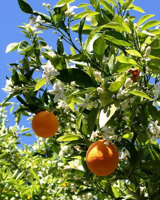 There's a whispering breeze in the trees, like the sounds of a corn broom being briskly swept on a concrete patio... swish swish. The fragrant orange blossoms fall from the tree looking like popcorn cascading down onto the grass. Ro sits on each backyard chair bench and looks expectantly around for their pooch, wanting to pet her before she bounds up to lick his face. Leaves in the fountain waiting to be plucked out of the water. Swish swish the breeze blows.