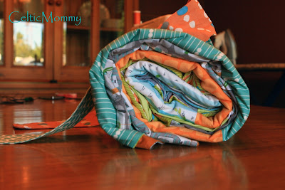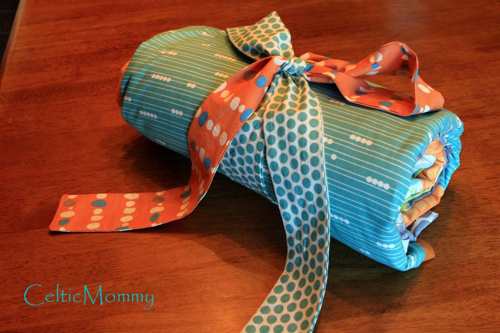 For the front, I used ten fabrics. Each rectangle is an 18 x 44" (a 1/2 yard cut) piece before washing and sewing. I sewed the left and right fabrics together and then matched the seams to sew each of the five pieces to one another. I made the ties with 2 2 1/2 x 44" strips for each tie. They are placed as you can see in the below photo in the center of one side of the picnic blanket (also see top photo) so that it can be folded down small to wrap, tie and be carried by a munchkin.