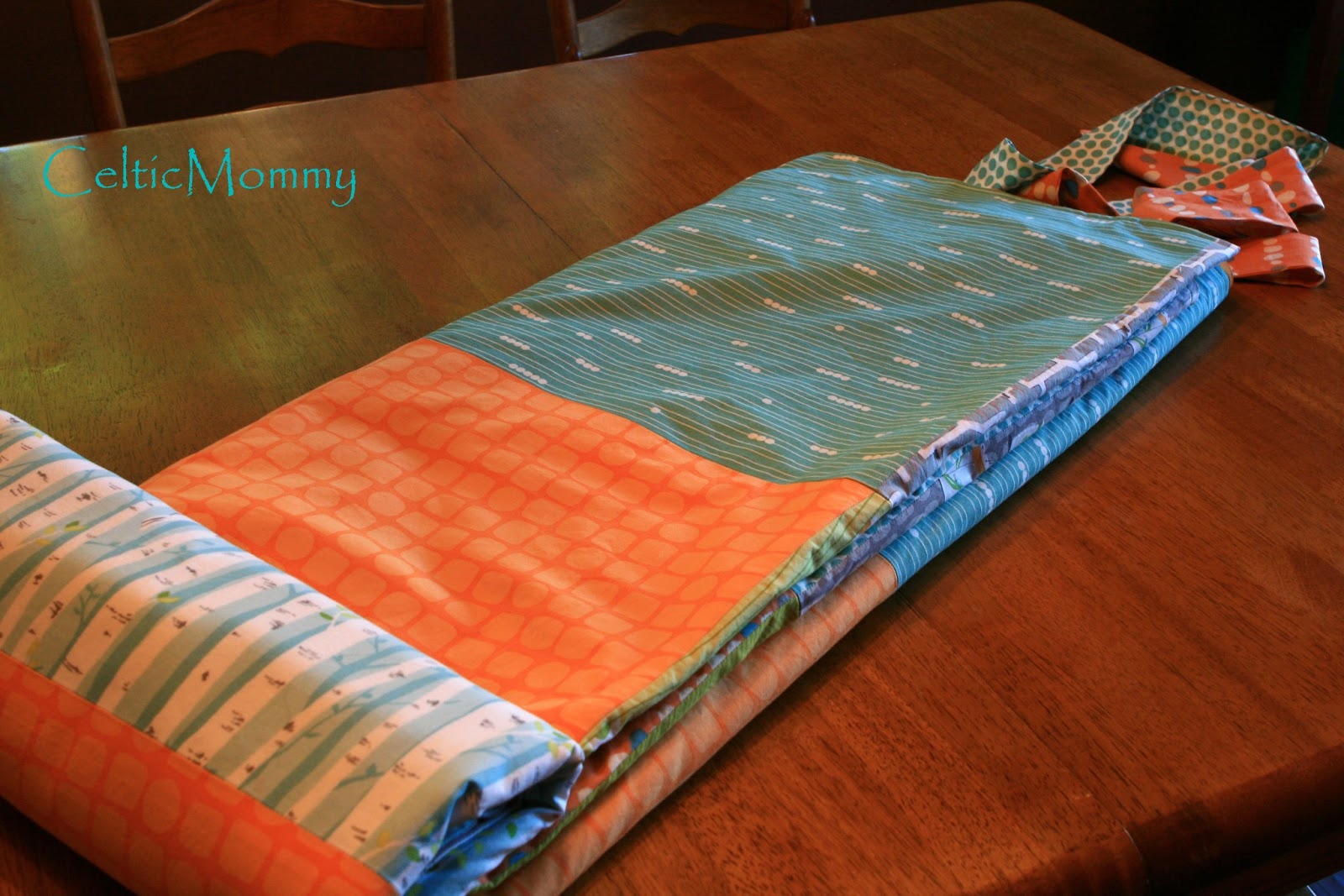 surgeries keeping me home resting while Em and Ro were at school, I took out that notebook and looked at my plans for a blanket once again. Having finished a twin-sized crochet blanket for the couch while I was recuperating and sleeping many hours away, I wanted to get the sewing machine out and do something else. I could sit for longer stretches of time without being too tired and sore so sewing would be easier. I got out a fabric bundle coordinated by the lovely owner of