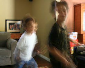 Still in jammies, beating the heat in our own living room dance-a-thon!