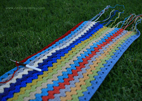 I found this pattern from Lucy of Attic24 last year and thought "one day I'll have patience for that". It's not hard, just time consuming and sometimes boring if you sit and sit and sit at it. My lack of time makes it perfect! It is easy to set up and easy to pick up/put down whenever I want to. I took every color of Cotton-Ease in my stash and made a pattern of not having a pattern and off my hook went. I'm trying to do one stripe a day-- two rows at about an inch or so. By the time school starts, I should be mostly done with it.