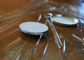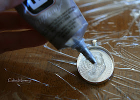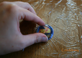 Carefully flip the cabochon upside down and move to a clean part of the Saran Wrap. You can gently wipe the excess glue from the sides with a paper towel. Don't worry about any glue on the back. At this point, if you try to move your image, it will get ruined. Leave alone for another 2 minutes.