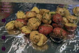 Place potatoes and marinade on the right side of a piece of tin foil, about 18 inches long. Fold left side of tin foil over and close securely. Cut two slits in top of tin foil and place on a medium-flamed BBQ.