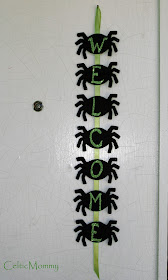 Once all the letters were done, I lined them up on a piece of plastic wrap and glued each spider to a long strip of ribbon. Since the spiders are so light, I put a little rock on top of each spider to weight it down while the glue dried. Once dry, I looped the top section of ribbon so I could hang it on a nail. An hour later, it was on my front door! A fun and fast decoration for the cost of just the seven spiders: $1.40!! Everything else I had on hand. We also bought a bunch of wooden pumpkins, ghosties and witches hats, but that's a craft for another day.