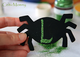 Using a green paint I also had in the house, I started to paint the letters on, but it looked a little boring. Glitter to the rescue! While the paint was still wet, I applied the glitter directly on top and let the spiders dry.