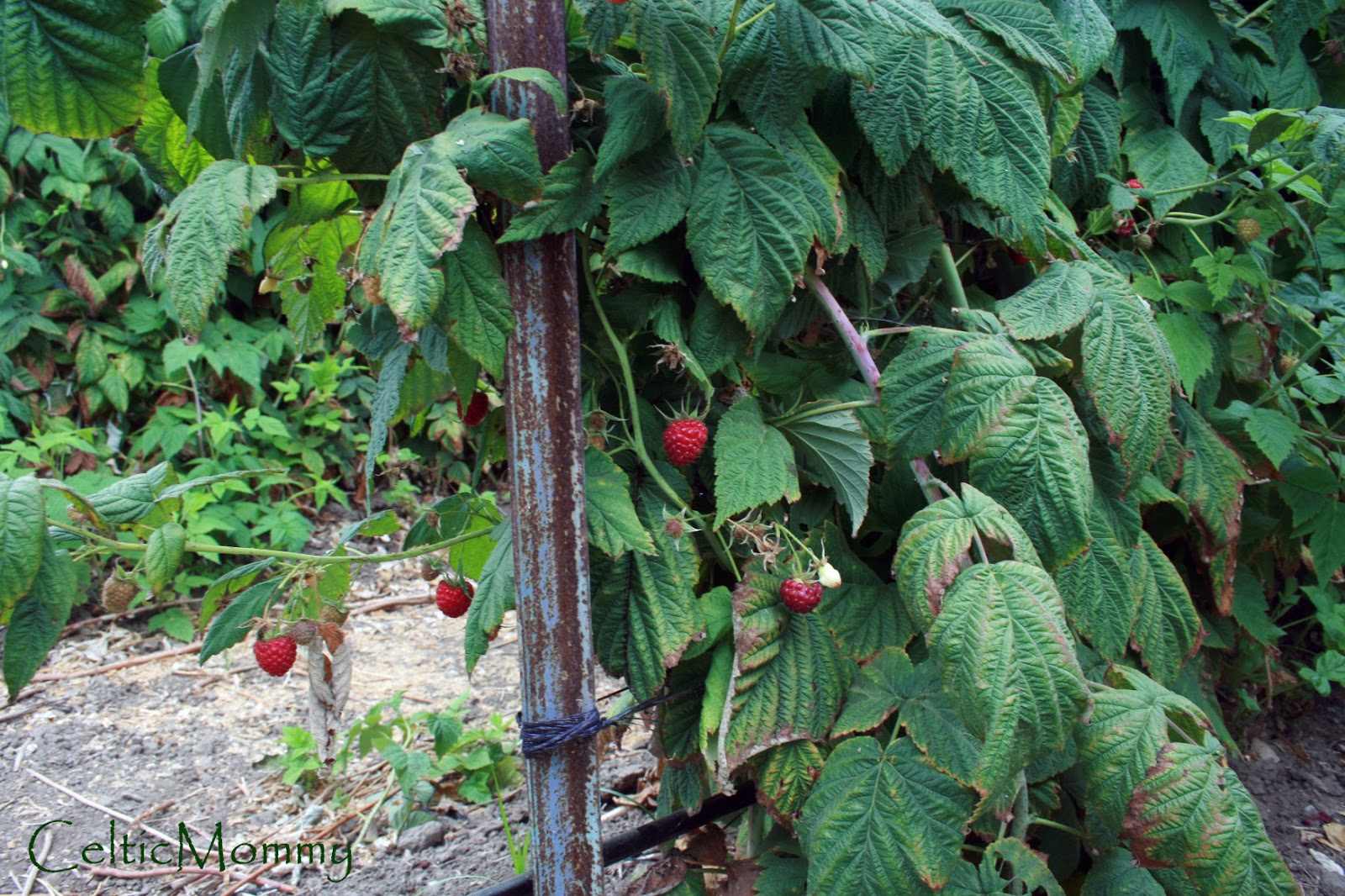 After blueberry satisfaction was had, we made our way to the raspberries.  "Wow Mom, it's like we're in another world here... I can't hear anything above the buzzing of the bees!!  Incredible!",  Em exclaimed.  And it was.  Ro talked low and slow to each bee he passed "enjoy the raspberries little bees... here's a pretty flower for you."  (Can you spot the bees in the below photo?  It will enlarge if you click on it.)