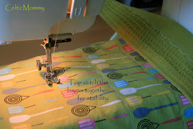 Working with your fabric design, top-stitch several rows. If you are a quilter, you can have fun with this. I just made rows in between my fabric's design. The top-stitching adds stability for when the mat is in use and especially when washed.